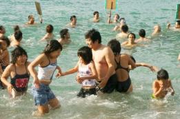 NEWS『紀北町海山区引本浦の高浜海岸で、恒例の新春寒中水泳大会が開かれた。心身の健康や水泳競技の記録向上などを願い海山水泳協会が毎年開催。地元のスイミングクラブや中学・高校の水泳部などから幼児−60歳代の約150人が参加した。例年通り海岸の清掃をした後、準備体操。この後、年少者から順番に海に入り、約70メートル先に停泊している尾鷲海上保安部の巡視艇を目指した。水温は15・5度。参加者は「冷たーい」などと声を上げながら、元気に水しぶきを上げていた。』