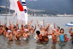 NEWS『長崎市の特定非営利活動法人(NPO法人)「長崎游泳協会」(田中直英理事長)の初泳ぎが3日、同市小瀬戸町にある通称「ねずみ島」の浜辺であり、約70人が寒中水泳に挑んだ。1902(明治35)年から続く新春恒例の伝統行事