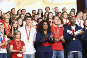 前列中央)が五輪選手の帰国を祝うパーティーを主催。左隣は競泳のフェルプス。』