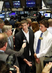 イケル・フェルプスが9日、ニューヨーク証券取引所を訪れた。 フェルプスは、同じく代表チームの金メダリスト、ライアン・ロクテ、ナタリー・コーグリンとともににこやかにインタビューを受けていた。』