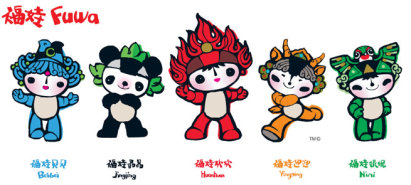 まずは北京オリンピックのオフィシャルマスコット「福娃(フーアー)」 オリンピックの五輪をイメージした5人の小さな子供たちです。福娃貝貝(ベイベイ)は魚、福娃晶晶(ジンジン)はパンダ、福娃迎迎(インイン)はチベットカモシカ、福娃??(ニーニー)はツバメ、そして福娃歓歓(ファンファン)は聖火をモチーフにしています。5人の名前を並べると、「ベイジン