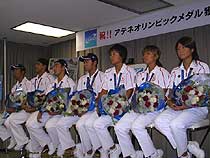 NEWS『アテネ五輪で戦後最多となる計8個のメダルを獲得した日本競泳陣が24日、成田着の航空機で帰国した。男子平泳ぎ百メートルと二百メートルを制し、競泳日本選手として初の1大会個人2冠に輝いた北島康介選手(日体大)は「まだ上にはハンセン(米国)の記録が残っている」と話し、両種目の世界記録更新にさらなる意欲を見せた。7人のメダリストは、成田市内のホテルで記者会見。北島選手は「五輪の舞台で金メダルを取るという夢を実現してホッとしている」と、安堵(あんど)の笑みを浮かべた。9月3日から始まる日本学生選手権にエントリーしているが、出場は体調などを考慮して決めるという。北島を指導する平井伯昌コーチは「4年後(北京五輪)の目標は当然、金メダルしかない。また一から始めていかなければいけない」と話した。』