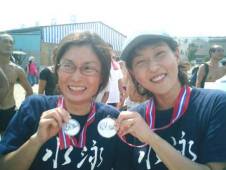 最後に初出場の森谷さんのゴールを待つ。ご主人が心配で心配で仕方のない様子。そんな中、波打ち際に行き、クラゲをわしづかみにして戻ってくる女性が…。「このクラゲは刺さないから大丈夫。」「ほ、ホント??。」「刺すのは電気クラゲだけなの。」「で、電気クラゲ??。」「電気クラゲに刺されたら、病院にいかなきゃダメなの。」う〜ん、さ、さすが中村さん。よく分かんないけど、すごい!!。そして、森谷さんがゴール!!。全員が無事泳ぎきりました!!。海の家に戻り、みんなで乾杯!!。とっても気がきく渡辺(姉)の差し入れでフルーツの盛り合わせ。「さすがお姉さん!!。」皆が絶賛!!。「で、でも、これ、妹が言い出したことなんです!!」妹をフォローするお姉さん。「言い出したのは妹でも、作ったのはお姉さんでしょ。」すると妹が「わ、私だって、タッパーの、ふたを閉めました…。」そして、昼食。食べ始めた頃、表彰式が始まった。男子は結果が出ているが、女子が出ていない。「たぶん西尾さんは入賞していると思うから表彰に出よう!!。」と表彰所へ。「続いて40台女子の部、第2位、西尾佐和子さん」「うわ〜!!。きゃ〜!!。」もうすごい盛り上がり。そして、「第5位、矢島のぞみさん!!」「すご〜い!!」これはすごい!!。入賞すると翌年の参加費が半額に!!。しばらく、砂浜で遊んで、帰りました。出場選手の皆様、お疲れ様でした。応援の皆様ありがとうございました!!。来年も出ましょう!!。写真は後日UPします!!。