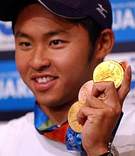 〇…「亜衣ちゃん」ファン、ひと安心!? 女子八百メートル自由形で金メダルに輝いた柴田亜衣(22)=鹿屋体大=が、快挙から一夜明けた21日に会見。現役続行の意向を明らかにした。「目標だった五輪出場を果たし、大学4年できりもいいので辞めようかと思ってた。でもメダルは取れたけど日本記録も出してないし、日本選手権も勝ってない。まだやることはある」前夜は金メダルを首にかけたまま寝てしまったといい「横を向いたら苦しかった。起きたときにちゃんと付いてたんでよかった」と笑わせた。